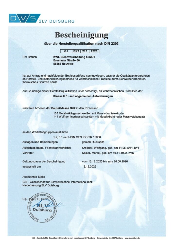 Bei uns steht Qualität an erster Stelle – und das belegen wir nicht nur durch unsere langjährige Erfahrung, sondern auch durch eine Vielzahl an Zertifizierungen. Diese sind ein klares Zeichen dafür, dass wir höchste Standards in der Blechverarbeitung einhalten und kontinuierlich daran arbeiten, unsere Prozesse, Produkte und Dienstleistungen zu optimieren.